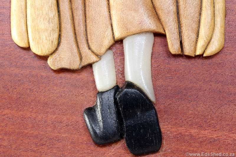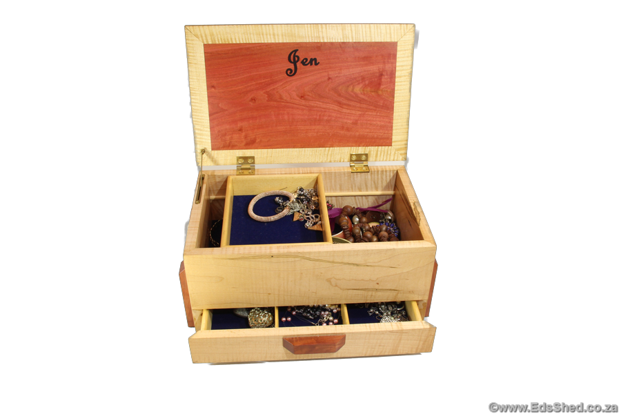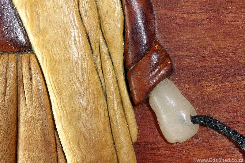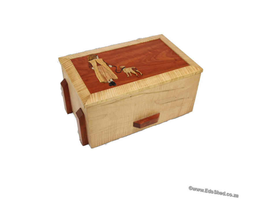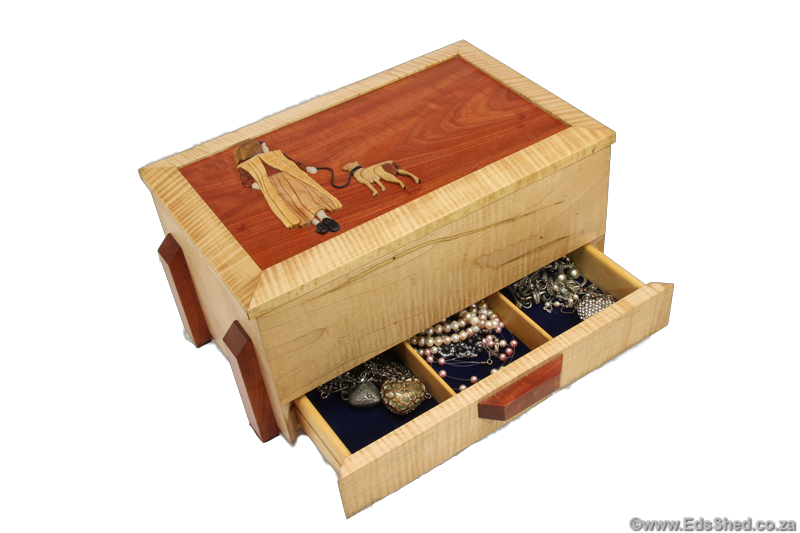 A jewellery box. Inspired by the Intarsia technique I’d seen in much larger works, I set about tackling this project using Intarsia in miniature - it took forever. The method involves cutting a hard grainy wood with a fret saw into many small pieces, working each piece individually then joining them back together again. The Ilala Palm find was the best, a natural fruit that works and looks like ivory, for the skin.