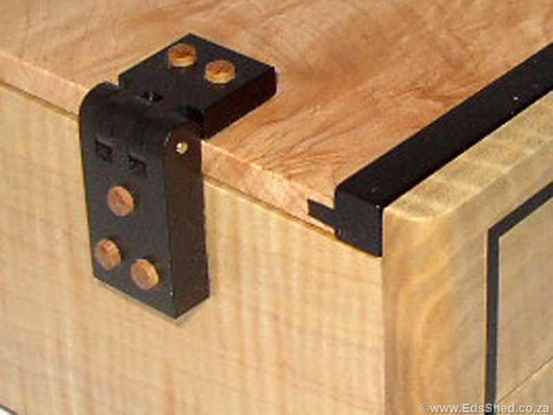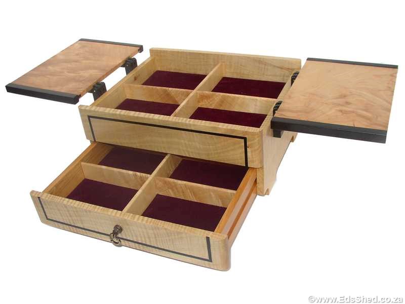 A jewellery box, a uniquely figured piece of solid Maple, book-matched for the top. Handmade hinges in African Blackwood held in place by hardwood pins. Curley Maple for the sides.