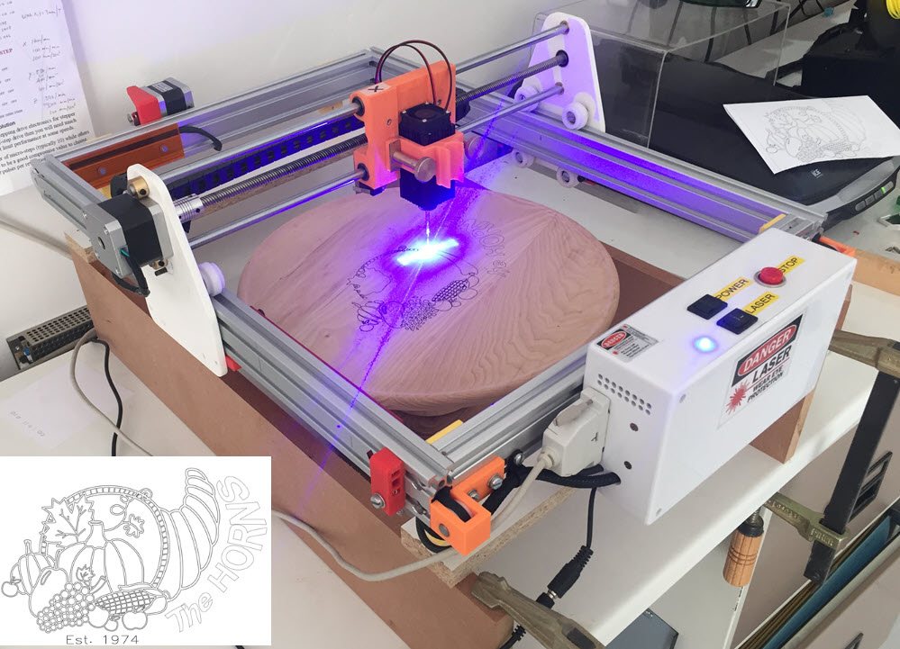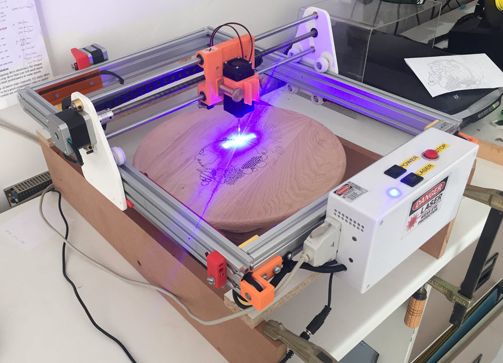 Many of the components were printed on the 3D printer which was a great learning curve. The low cost LED lasers are an easy way of getting into the hobby. The more powerful CO2 Lasers are bit daunting. The project took about 6 months.
